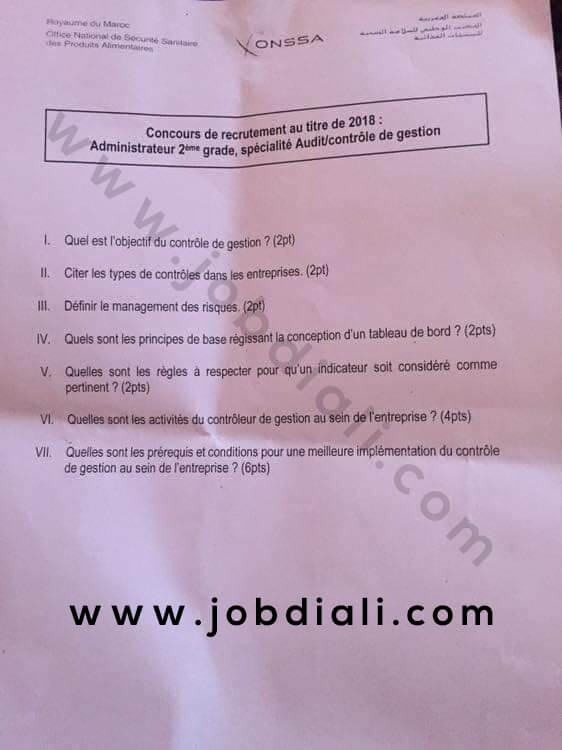 <div style="text-align: center;"><span style="font-family: inherit; font-size: large;">Exemple Concours de Recrutement des Administrateurs 2ème grade</span></div> <div style="text-align: center;"><span style="color: red; font-family: inherit; font-size: large;"><b>2018</b></span></div> <div style="text-align: center;"><span style="font-family: inherit; font-size: large;">Spécialité: Audit / Contrôle de Gestion</span></div> <div style="text-align: center;"><span style="font-family: inherit; font-size: large;">Office National de Sécurité Sanitaire des Produits Alimentaires (ONSSA)</span> <div style="clear: both; text-align: center;"><a style="margin-left: 1em; margin-right: 1em;" href="https://1.bp.blogspot.com/-0iGJllQ_Svo/XcmBLvi01BI/AAAAAAAAAMQ/Io8bFY3ulK8Bb6RA8zcXtBlRz5pe5HtBACLcBGAsYHQ/s1600/Audit%2B%2BContr%25C3%25B4le%2Bde%2BGestion%2B-%2BONSSA.jpg"><img class="aligncenter" title="Exemple Concours de Recrutement des Administrateurs 2ème grade 2018 (Audit / Contrôle de Gestion) - ONSSA" src="https://1.bp.blogspot.com/-0iGJllQ_Svo/XcmBLvi01BI/AAAAAAAAAMQ/Io8bFY3ulK8Bb6RA8zcXtBlRz5pe5HtBACLcBGAsYHQ/s1600/Audit%2B%2BContr%25C3%25B4le%2Bde%2BGestion%2B-%2BONSSA.jpg" alt="Exemple Concours de Recrutement des Administrateurs 2ème grade 2018 (Audit / Contrôle de Gestion) - ONSSA" border="0" data-original-height="750" data-original-width="562" /></a></div> </div> <!-- wp:block {"ref":851} /-->