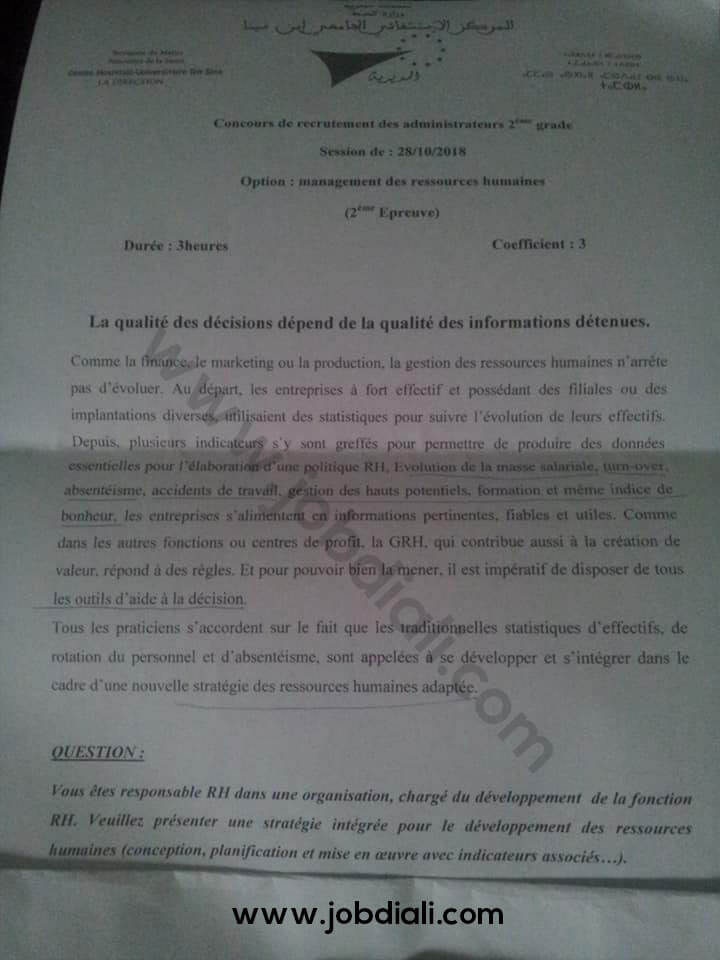 Exemple Concours de Recrutement des Administrateurs 2ème grade 28-10-2018 Option: Management des Ressources Humaines Centre Hospitalier Ibn Sina