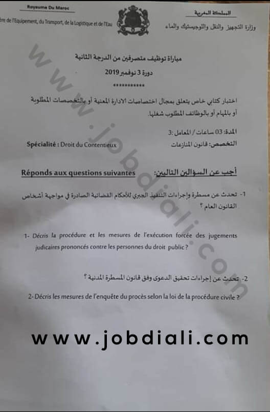 <div style="background-color: white; border: 0px; box-sizing: border-box; margin: 0px; outline: 0px; overflow-wrap: break-word; padding: 0px; text-align: center; vertical-align: baseline;"><span style="font-family: inherit; font-size: large;"><span style="border: 0px; box-sizing: border-box; font-style: inherit; font-weight: inherit; margin: 0px; outline: 0px; overflow-wrap: break-word; padding: 0px; vertical-align: baseline;">Exemple Concours de Recrutement </span><span style="border: 0px; box-sizing: border-box; font-style: inherit; font-weight: inherit; margin: 0px; outline: 0px; overflow-wrap: break-word; padding: 0px; vertical-align: baseline;">des Administrateurs 2ème grade</span></span></div> <div style="background-color: white; border: 0px; box-sizing: border-box; margin: 0px; outline: 0px; overflow-wrap: break-word; padding: 0px; text-align: center; vertical-align: baseline;"><span style="border: 0px; box-sizing: border-box; font-style: inherit; font-weight: inherit; margin: 0px; outline: 0px; overflow-wrap: break-word; padding: 0px; vertical-align: baseline;"><span style="border: 0px; box-sizing: border-box; color: red; font-style: inherit; font-weight: inherit; margin: 0px; outline: 0px; overflow-wrap: break-word; padding: 0px; vertical-align: baseline;"><span style="border: 0px; box-sizing: border-box; font-style: inherit; font-weight: 600; margin: 0px; outline: 0px; overflow-wrap: break-word; padding: 0px; vertical-align: baseline;"><span style="font-family: inherit; font-size: large;">03-11-2019</span></span></span></span><br /><span style="border: 0px; box-sizing: border-box; margin: 0px; outline: 0px; overflow-wrap: break-word; padding: 0px; vertical-align: baseline;"><span style="border: 0px; box-sizing: border-box; margin: 0px; outline: 0px; overflow-wrap: break-word; padding: 0px; vertical-align: baseline;"><span style="border: 0px; box-sizing: border-box; margin: 0px; outline: 0px; overflow-wrap: break-word; padding: 0px; vertical-align: baseline;"><span style="font-size: large;">Ministère de l'Equipement, du Transport de la Logistique et de l'eau</span></span></span></span><br /><span style="font-size: large;"><u>Spécialité:</u> Droit des Contentieux (قانون المنازعات</span><span style="font-size: large;">)</span> <div style="clear: both; text-align: center;"><a style="margin-left: 1em; margin-right: 1em;" href="https://1.bp.blogspot.com/-0n7NVm-xAuk/XccVoFmGOsI/AAAAAAAACb4/lx_iJb91OEEf_0-Cxz15KKamxpbErux0wCLcBGAsYHQ/s1600/75132181_2756165801114280_8835687436651593728_o.jpg"><img class="aligncenter" title="Exemple Concours de Recrutement des Administrateurs 2ème grade 2019 - Ministère de l'Equipement, du Transport de la Logistique et de l'eau" src="https://1.bp.blogspot.com/-0n7NVm-xAuk/XccVoFmGOsI/AAAAAAAACb4/lx_iJb91OEEf_0-Cxz15KKamxpbErux0wCLcBGAsYHQ/s640/75132181_2756165801114280_8835687436651593728_o.jpg" alt="Exemple Concours de Recrutement des Administrateurs 2ème grade 2019 - Ministère de l'Equipement, du Transport de la Logistique et de l'eau" width="416" height="640" border="0" data-original-height="828" data-original-width="540" /></a><a style="margin-left: 1em; margin-right: 1em;" href="https://1.bp.blogspot.com/-NgAgn6ATs1A/XccY-aQQ94I/AAAAAAAACcE/MXuISIw5VT8BGwlJoCYt6tj_Z7b0aAMSACLcBGAsYHQ/s1600/Droit%2Bdes%2BContentieux.jpg"><img class="aligncenter" title="Exemple Concours de Recrutement des Administrateurs 2ème grade 2019 - Ministère de l'Equipement, du Transport de la Logistique et de l'eau" src="https://1.bp.blogspot.com/-NgAgn6ATs1A/XccY-aQQ94I/AAAAAAAACcE/MXuISIw5VT8BGwlJoCYt6tj_Z7b0aAMSACLcBGAsYHQ/s640/Droit%2Bdes%2BContentieux.jpg" alt="Exemple Concours de Recrutement des Administrateurs 2ème grade 2019 - Ministère de l'Equipement, du Transport de la Logistique et de l'eau" width="420" height="640" border="0" data-original-height="804" data-original-width="528" /></a></div> </div> <!-- wp:block {"ref":851} /-->