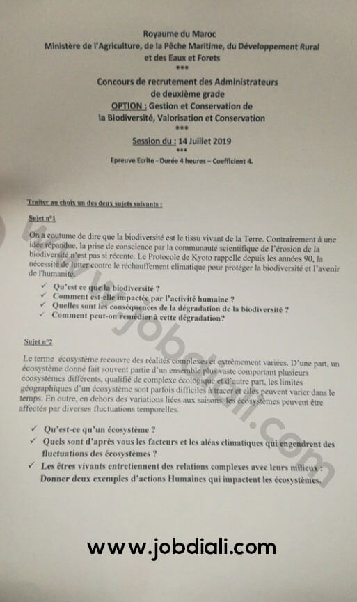 <div style="background-color: white; border: 0px; box-sizing: border-box; margin: 0px; outline: 0px; overflow-wrap: break-word; padding: 0px; text-align: center; vertical-align: baseline;"><span style="border: 0px; box-sizing: border-box; font-style: inherit; font-weight: inherit; margin: 0px; outline: 0px; overflow-wrap: break-word; padding: 0px; vertical-align: baseline;"><span style="border: 0px; box-sizing: border-box; font-style: inherit; font-weight: inherit; margin: 0px; outline: 0px; overflow-wrap: break-word; padding: 0px; vertical-align: baseline;"><span style="border: 0px; box-sizing: border-box; font-style: inherit; font-weight: inherit; margin: 0px; outline: 0px; overflow-wrap: break-word; padding: 0px; vertical-align: baseline;"><span style="border: 0px; box-sizing: border-box; font-style: inherit; font-weight: inherit; margin: 0px; outline: 0px; overflow-wrap: break-word; padding: 0px; vertical-align: baseline;"><span style="border: 0px; box-sizing: border-box; font-style: inherit; font-weight: inherit; margin: 0px; outline: 0px; overflow-wrap: break-word; padding: 0px; vertical-align: baseline;"><span style="font-family: inherit; font-size: large;">Exemple Concours de Recrutement des Administrateurs 2ème grade</span></span></span></span></span></span></div> <div style="background-color: white; border: 0px; box-sizing: border-box; margin: 0px; outline: 0px; overflow-wrap: break-word; padding: 0px; text-align: center; vertical-align: baseline;"><span style="border: 0px; box-sizing: border-box; font-style: inherit; font-weight: inherit; margin: 0px; outline: 0px; overflow-wrap: break-word; padding: 0px; vertical-align: baseline;"><span style="border: 0px; box-sizing: border-box; font-style: inherit; font-weight: inherit; margin: 0px; outline: 0px; overflow-wrap: break-word; padding: 0px; vertical-align: baseline;"><span style="font-family: inherit; font-size: large;">Option: Gestion et Conservation de la Biodiversité, Valorisation et Conservation</span></span></span></div> <div style="background-color: white; border: 0px; box-sizing: border-box; margin: 0px; outline: 0px; overflow-wrap: break-word; padding: 0px; text-align: center; vertical-align: baseline;"><span style="border: 0px; box-sizing: border-box; font-style: inherit; margin: 0px; outline: 0px; overflow-wrap: break-word; padding: 0px; vertical-align: baseline;"><span style="border: 0px; box-sizing: border-box; font-style: inherit; margin: 0px; outline: 0px; overflow-wrap: break-word; padding: 0px; vertical-align: baseline;"><span style="color: red; font-family: inherit; font-size: large;"><b>14-07-2019</b></span></span></span></div> <div style="background-color: white; border: 0px; box-sizing: border-box; margin: 0px; outline: 0px; overflow-wrap: break-word; padding: 0px; text-align: center; vertical-align: baseline;"><span style="border: 0px; box-sizing: border-box; font-style: inherit; font-weight: inherit; margin: 0px; outline: 0px; overflow-wrap: break-word; padding: 0px; vertical-align: baseline;"><span style="border: 0px; box-sizing: border-box; font-style: inherit; font-weight: inherit; margin: 0px; outline: 0px; overflow-wrap: break-word; padding: 0px; vertical-align: baseline;"><span style="border: 0px; box-sizing: border-box; font-style: inherit; font-weight: inherit; margin: 0px; outline: 0px; overflow-wrap: break-word; padding: 0px; vertical-align: baseline;"><span style="font-family: inherit; font-size: large;">Ministère de l'Agriculture de la Pêche Maritime du Développement Rurale et des Eaux et Forêts</span></span></span></span></div> <div style="clear: both; text-align: center;"><a style="margin-left: 1em; margin-right: 1em;" href="https://1.bp.blogspot.com/-06e9N119vHk/XYvoG0MWF5I/AAAAAAAAB1I/WdAuiKq1gfYoMrI3wXDbvOHrifrYU2BWACEwYBhgL/s1600/minist%25C3%25A8re%2Bde%2Bl%2527agriculture%2Bde%2Bla%2Bp%25C3%25AAche%2Bmaritime%2Bdu%2Bd%25C3%25A9veloppement%2Brurale%2Bet%2Bdes%2Beaux%2Bet%2Bfor%25C3%25AAts.png"><img style="display: none;" title="Exemple Concours de Recrutement des Administrateurs 2ème grade 2019 - Ministère de l'Agriculture et de la Pêche Maritime" src="https://1.bp.blogspot.com/-06e9N119vHk/XYvoG0MWF5I/AAAAAAAAB1I/WdAuiKq1gfYoMrI3wXDbvOHrifrYU2BWACEwYBhgL/s320/minist%25C3%25A8re%2Bde%2Bl%2527agriculture%2Bde%2Bla%2Bp%25C3%25AAche%2Bmaritime%2Bdu%2Bd%25C3%25A9veloppement%2Brurale%2Bet%2Bdes%2Beaux%2Bet%2Bfor%25C3%25AAts.png" alt="Exemple Concours de Recrutement des Administrateurs 2ème grade 2019 - Ministère de l'Agriculture et de la Pêche Maritime" width="320" height="185" border="0" data-original-height="335" data-original-width="579" /></a></div> <div style="clear: both; text-align: center;"><a style="margin-left: 1em; margin-right: 1em;" href="https://1.bp.blogspot.com/-FHPsV7qU80A/XYwDOjUcLYI/AAAAAAAAB3A/q4BI6c9REzc7Zz9loBLDI20SwQ7P1R8uwCLcBGAsYHQ/s1600/Exemple%2BConcours%2Bde%2BRecrutement%2Bdes%2BAdministrateurs%2B2%25C3%25A8me%2Bgrade.jpg"><img class="aligncenter" title="Exemple Concours de Recrutement des Administrateurs 2ème grade 2019 - Ministère de l'Agriculture et de la Pêche Maritime" src="https://1.bp.blogspot.com/-FHPsV7qU80A/XYwDOjUcLYI/AAAAAAAAB3A/q4BI6c9REzc7Zz9loBLDI20SwQ7P1R8uwCLcBGAsYHQ/s1600/Exemple%2BConcours%2Bde%2BRecrutement%2Bdes%2BAdministrateurs%2B2%25C3%25A8me%2Bgrade.jpg" alt="Exemple Concours de Recrutement des Administrateurs 2ème grade 2019 - Ministère de l'Agriculture et de la Pêche Maritime" border="0" data-original-height="864" data-original-width="513" /></a></div> <!-- wp:block {"ref":625} /-->