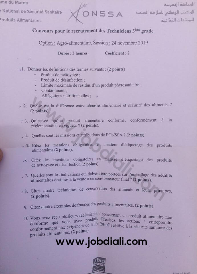 <div style="text-align: center;"><span style="font-family: inherit; font-size: large;">Exemple Concours de Recrutement des techniciens 3ème grade</span></div> <div style="text-align: center;"><span style="color: red; font-family: inherit; font-size: large;"><b>24-11-2019</b></span><br /><span style="font-size: large;"><b>Option:</b> <span style="background-color: lime;">Agro Alimentaire</span></span></div> <div style="text-align: center;"><span style="font-family: inherit; font-size: large;">Office National de Sécurité Sanitaire des Produits Alimentaires (ONSSA)</span> <div style="clear: both; text-align: center;"><a style="margin-left: 1em; margin-right: 1em;" href="https://1.bp.blogspot.com/-2S5PlqNB-Rc/Xez9ZUMS_KI/AAAAAAAAAPo/z5TmOSeXDnwa3k0ZwEjcu46gMWO5pHA1wCLcBGAsYHQ/s1600/agro-alimentaire-onssa-2019.jpg"><img class="aligncenter" title="Exemple Concours de Recrutement des techniciens 3ème grade (Agro-alimentaire) 2019 - ONSSA" src="https://1.bp.blogspot.com/-2S5PlqNB-Rc/Xez9ZUMS_KI/AAAAAAAAAPo/z5TmOSeXDnwa3k0ZwEjcu46gMWO5pHA1wCLcBGAsYHQ/s640/agro-alimentaire-onssa-2019.jpg" alt="Exemple Concours de Recrutement des techniciens 3ème grade (Agro-alimentaire) 2019 - ONSSA" width="460" height="640" border="0" data-original-height="960" data-original-width="691" /></a></div> </div> <!-- wp:block {"ref":851} /-->