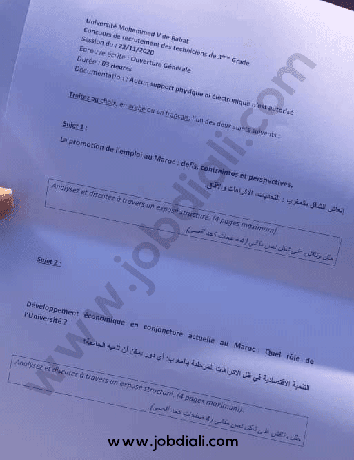 Exemple Concours des Techniciens 3ème Grade 2020 – Université Mohammed V de Rabat